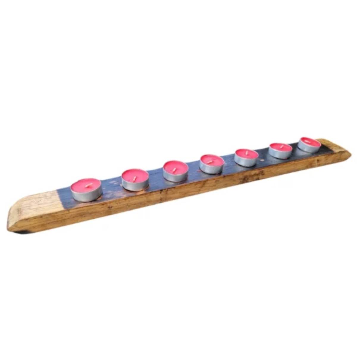 Seven recessed tea light cups run along the length of the holder, creating a line of soft, flickering light. It works beautifully as a dining table centrepiece, a feature on a mantelpiece, or a cosy accent on a coffee table or sideboard. The distressed finish and steel‑band marks match perfectly with your other whiskey barrel furniture.