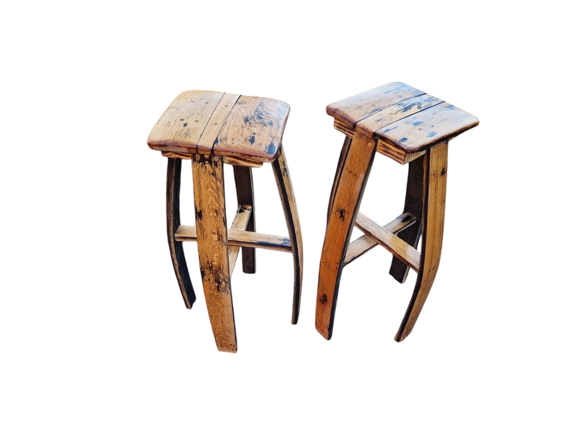 Accompanying the table are two handcrafted barrel stools, carefully designed for both durability and comfort. Their ergonomic structure provides a sturdy yet comfortable seating experience, making them perfect for social gatherings or casual drinks at home.