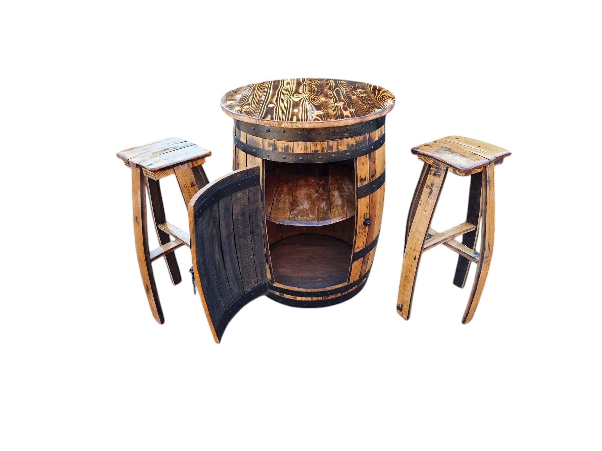 Enhance your space with this whiskey barrel table set, crafted from authentic reclaimed barrels. Featuring a spacious tabletop, hidden storage, and two sturdy stools, it’s the perfect blend of rustic charm and functionality.